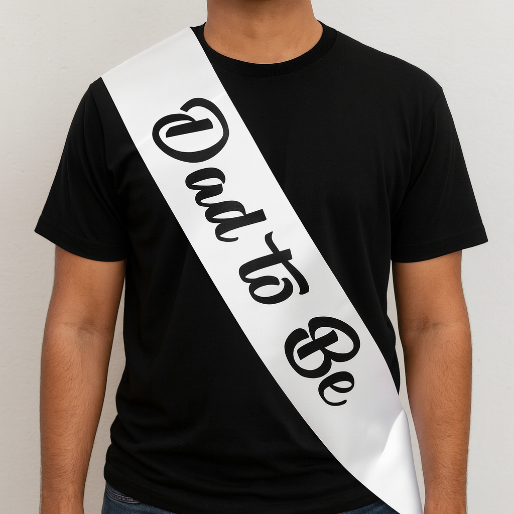 Celebrate the dad-to-be with our elegant white satin sash. Perfect for baby showers, gender reveal parties & photoshoots. Comfortable & reusable.