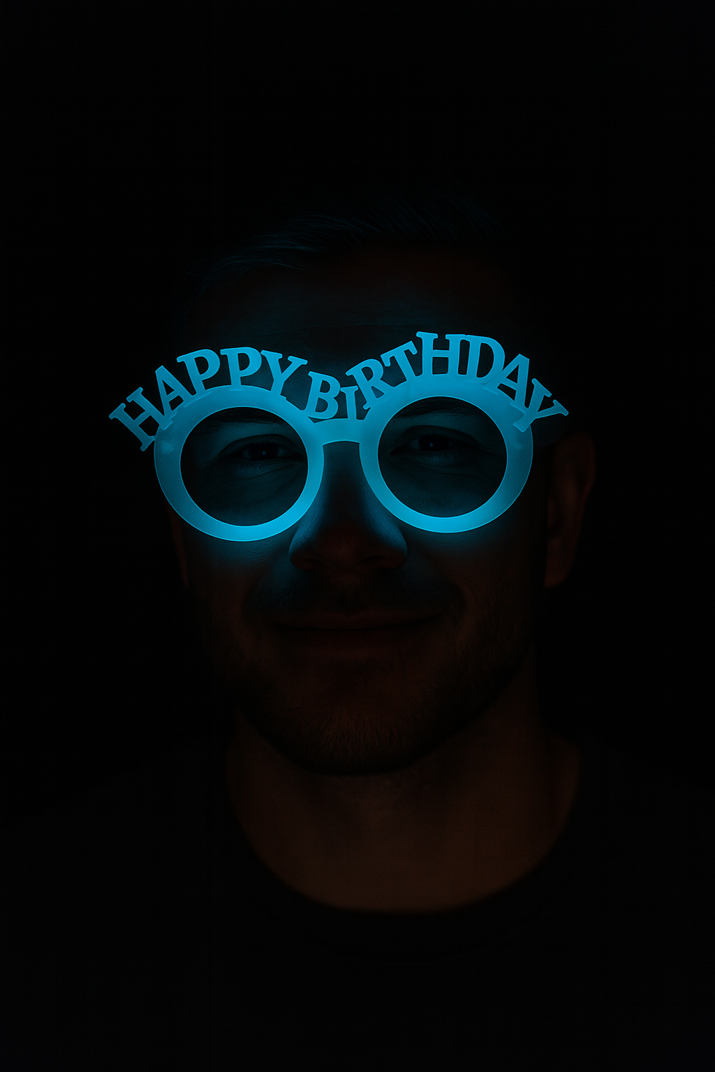 • Vibrant neon-colored “Happy Birthday” sunglasses